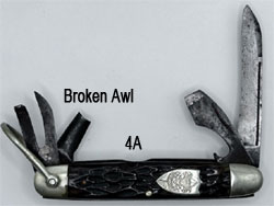 | There are color variations in bone handles. The bone was dyed, differences are created in the manufacturing process. I haven't investigated enough examples to determine if eagle left or right is more scarce. These knives were made for about 20 years. You can track improvements. Early models had a bent can opener pull and short screw driver. Later ones had a round pull on the can opener and a longer screwdriver. Decorative lines were added to the bolster on later knives. The Ulster name was reintroduced in later years. I show modern Ulster knives on a separate page. | ||||||||